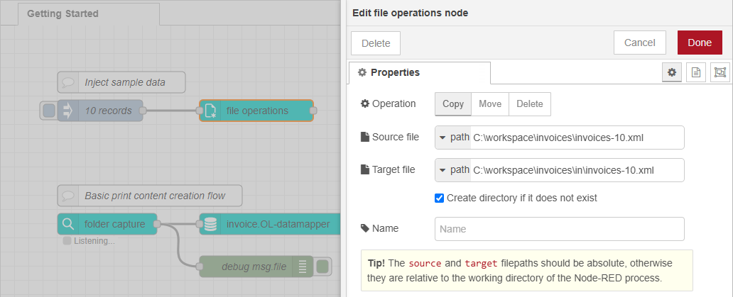 While this setup allows you to test the flow with different sample files, it’s not the most efficient approach. The inject nodes contain the full path to both the source and target files, as does the folder capture node. This makes it hard to relocate the flow to a different machine where the files might be located in a different place or on a different volume. In a scenario like this, all paths must be updated manually on the respective setup.