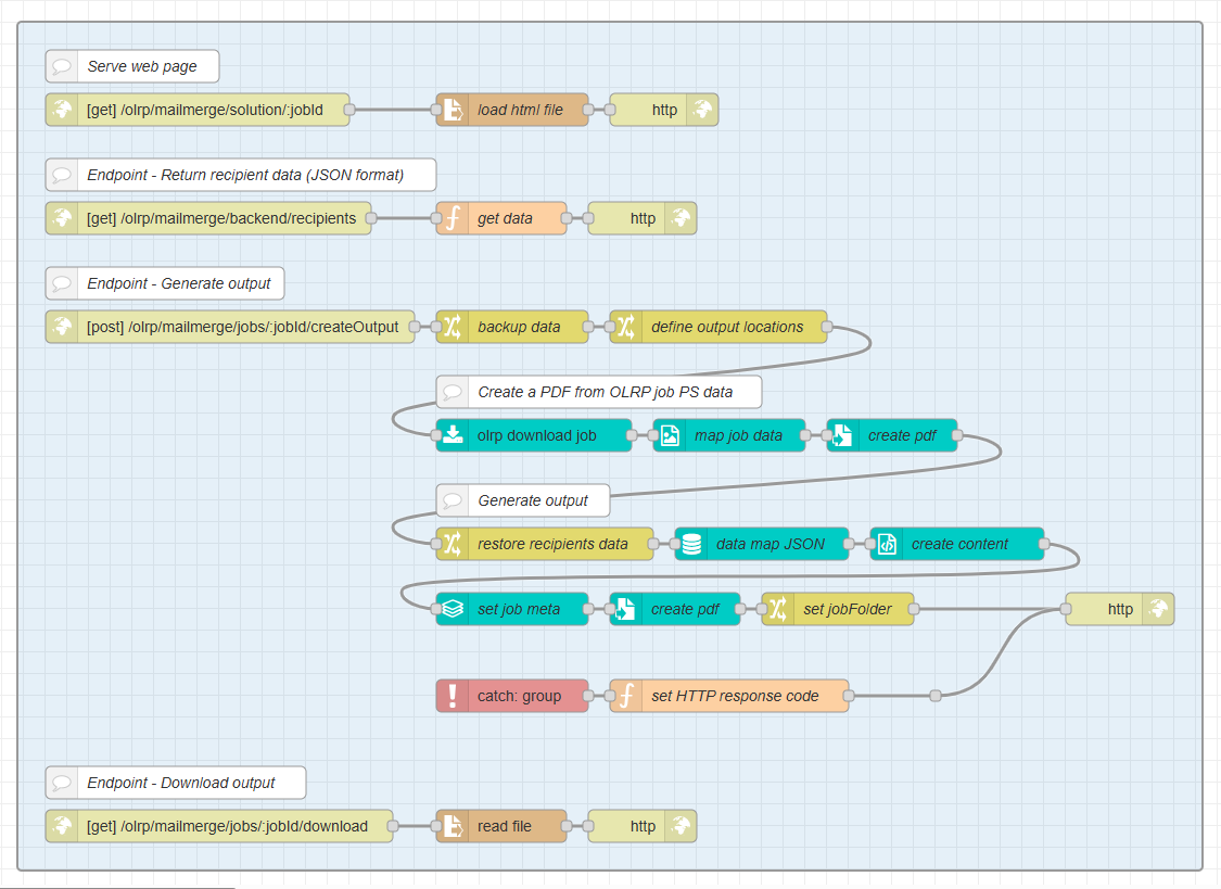 These flows are included as examples with the olrp nodes and can be imported using the Import option in the upper right menu. The required OL Connect resources can be downloaded from the OL Resource Center using the following link: mail-merge.zip.