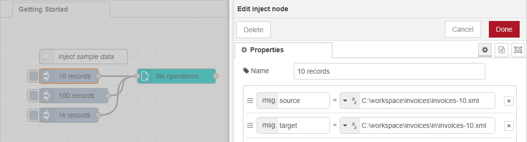 The image below shows how the inject node is configured with fixed paths for the msg.source and msg.target properties. You can add multiple inject nodes, each referencing a different sample file. Use the optional name field to give each inject node a custom label that describes the test scenario. All inject nodes link to the same file operations node.