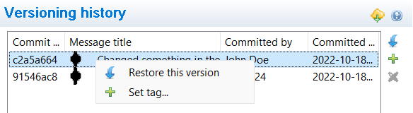 To restore a previous version, select the version, then select the Restore icon. The project is reset to the state it was in when that version was committed.