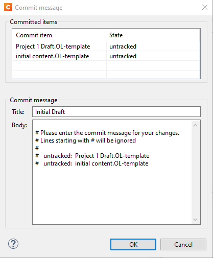 Enter information to describe the changes, then select OK. Describing the changes is important as it will allow you, later, to readily identify each version as you browse through the project history.