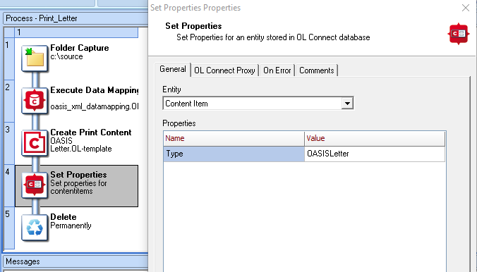 The process shown here creates letters and sets a property (Type: OASISLetter) on the new content items in the Connect database using the Set Properties task.