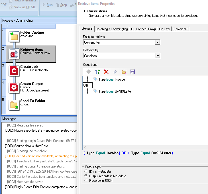 In the second phase, a process uses the Retrieve Items task to get all content items that have the Type property set to either OASISLetter or Invoice.