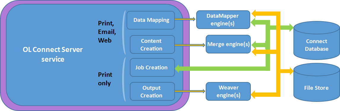 It communicates with the Workflow service (with the OL Connect plugins, specifically) and with the Designer when output is generated from the Designer. It creates records (by extracting data from a data source using a data mapping configuration), and jobs. It communicates with the engines (see below) in order to make them create content items and output (spool) files.