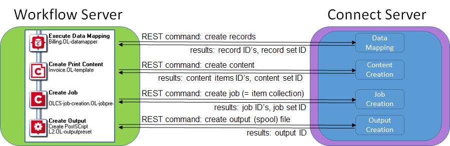 The figure below shows the communication between OL Connect tasks and the OL Connect server in a Print process.