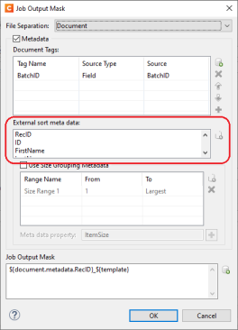 • External sort metadata is now catered for in the Job Output Mask in the Print Options page of the Output Preset and Print Wizards along with the job output mask dialog. (92784)