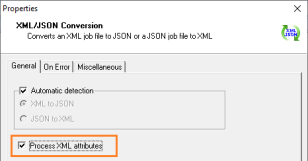 • Add support for XML attributes in the XML->JSON plugin converter, ensuring their values are stored in the job data for easy access in tasks like RunScript. (89733)