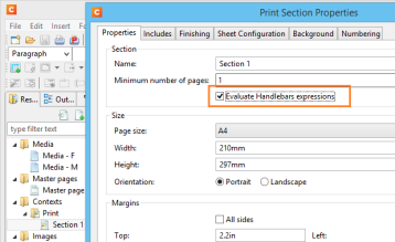 • Added a new option to automatically process Handlebar expressions in sections and master pages. This is turned on by default for new templates, but it needs to be enabled in the Properties dialog of sections for templates created in older versions. (86220)