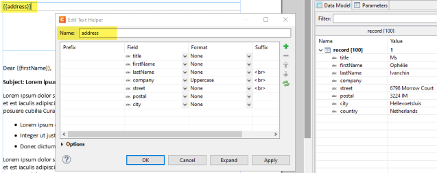 The following shows a classic Text Script approach to create an address block, in this case using the Handlebars Text Helper. When there are empty fields in the data, the respective line will be skipped. This prevents empty lines to show up in the text. In the example below this means their will be no empty line in case there is no company specified in the data.