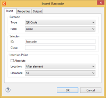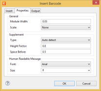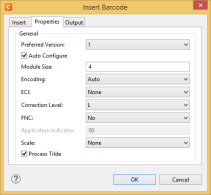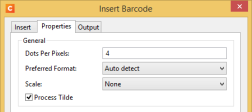 • Barcode properties can now be added at the time of barcode insertion, rather than afterwards in the Barcode properties dialog. The barcode insertion dialog is now split over three tabs, Insert, Properties and Output. (87729)