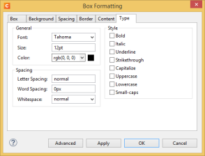 • A new Type tab has been added to the Box Formatting dialog. This allows you to apply text formatting styles on the text within a box. (87718)
