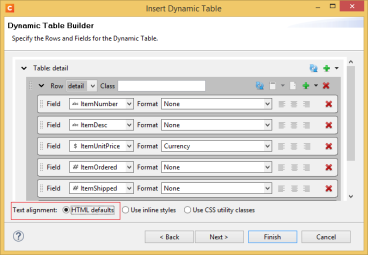 • Added new Text Alignment option of Default html which disables the text alignment options in the Dynamic Table Wizard. This allows you to style the text alignment of the columns yourself. (87214)