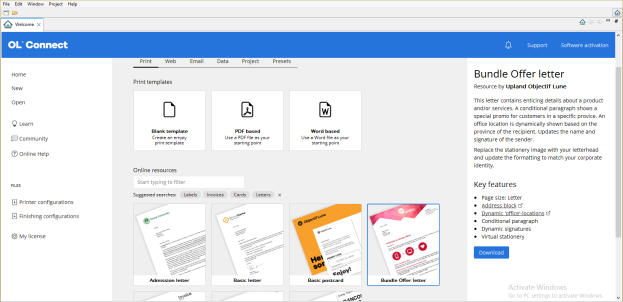 The new Learn section shows our most recent blog posts and lists the most popular hands-on tutorials and how-to’s. It provides access to a central repository of OL Connect content, including sample files, example projects, tutorials and blog posts.