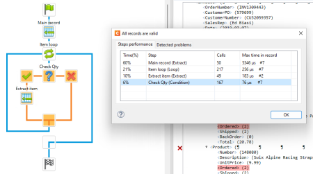 • The Validate all records option has been enhanced to display a table of all operations performed and the time spent in each step. This allows you to identify the steps that consume the most time and that could therefore be candidates for optimization. (86657)