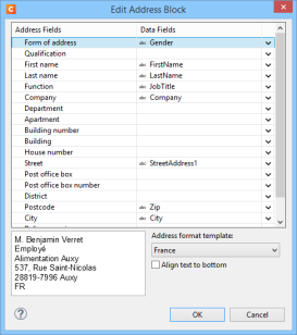 You can link data to the elements that compose the address details via the Address Block dialog. The feature automatically collapses empty lines, and provides an option to align the address to the bottom of the address block object.