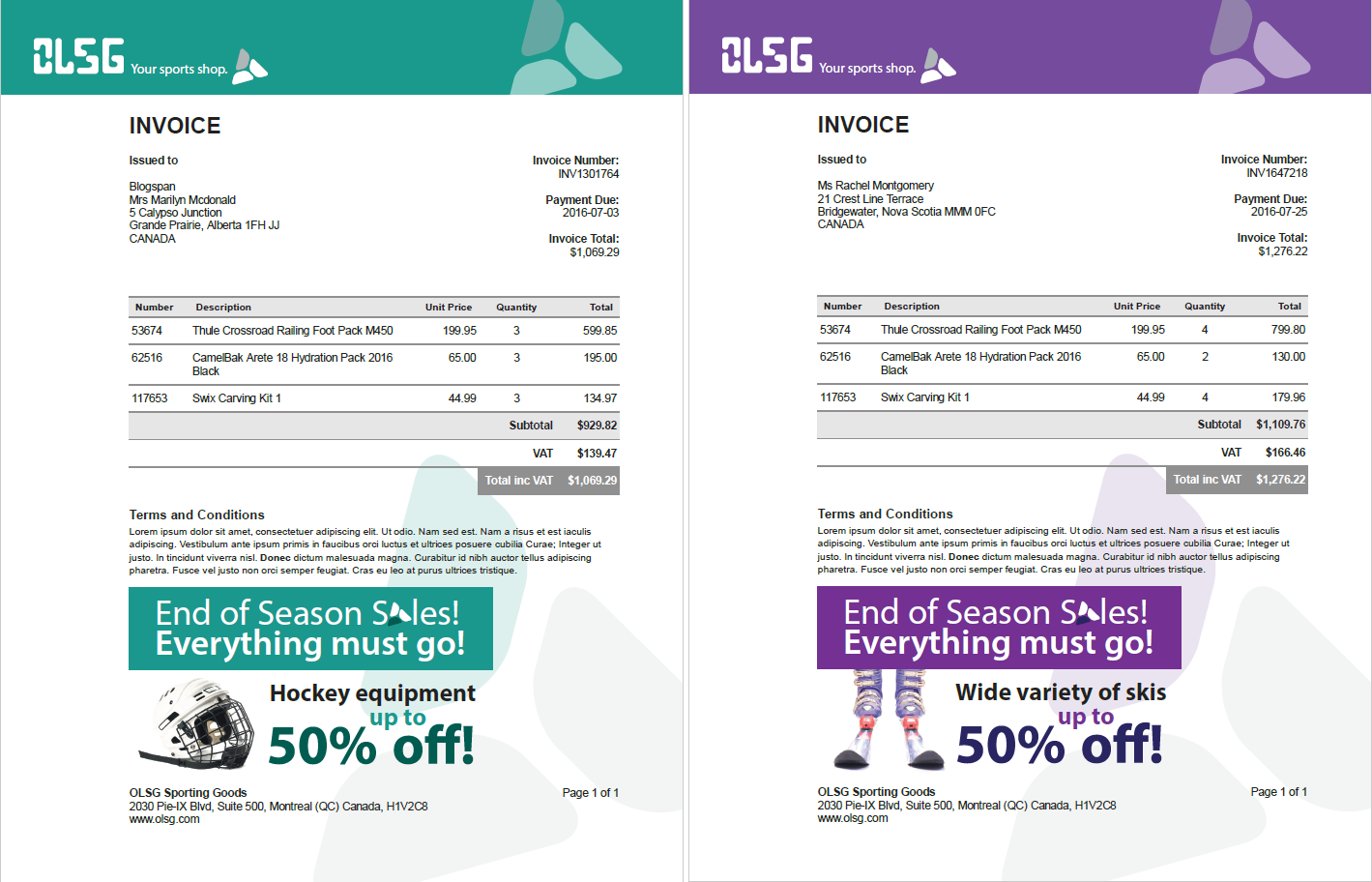The invoice data has to be printed in a table. The table should contain a transport line if it runs over two or more pages. The pages should be numbered.
