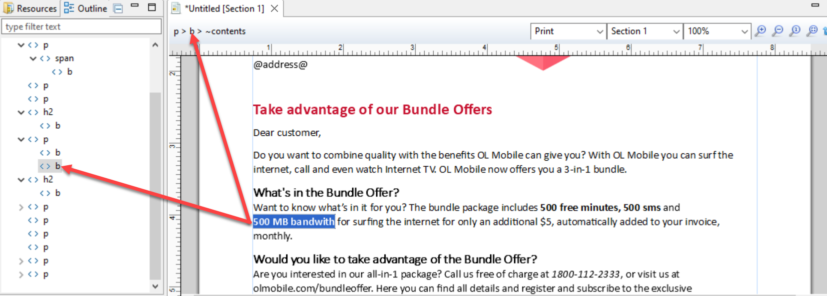 - Place the cursor in the text “500 MB bandwidth”. Now the breadcrumbs read p > b. This signifies that the bold text is a child element of the paragraph.