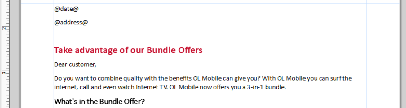 OL Connect Designer has many text editing and formatting capabilities. Applying formatting to selected text is referred to as local or inline formatting. Formatting could also be handled via style sheets, as will be demonstrated later.