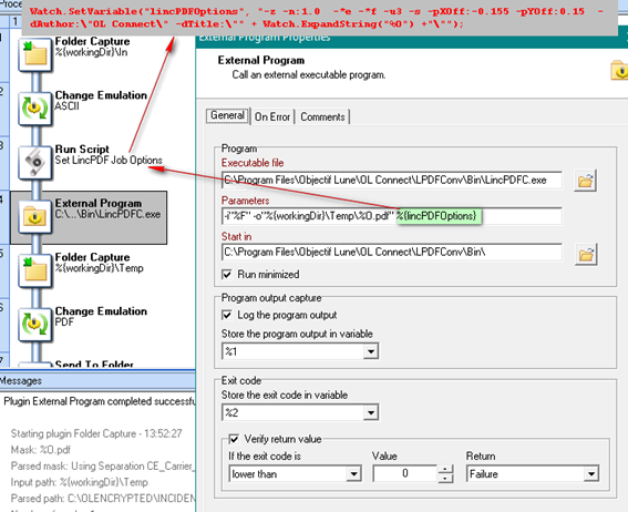 CopyWatch.SetVariable("lincPDFOptions","-z:1 -*e -*f -u3 -s -pXOff:-0.155 -pYOff:0.15 -dAuthor:\"OL Connect\" -dTitle:\"" + Watch.ExpandString("%O") + "\"");This example sets the following options or parameters: