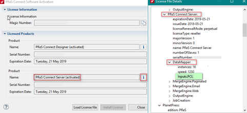 When the License File Details window opens, expand the OL Connect Server, then expand the DataMapper node. If the Inputs.PCL entry is present in that node, you have a PCL Input license.