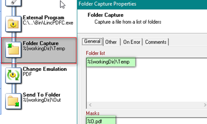 In another Workflow process, import the created PDF with the Folder Capture input plugin, specifying the output folder of the previous process (%{workingDir}\Temp in the example) as input folder, and %O.pdf as the file mask.