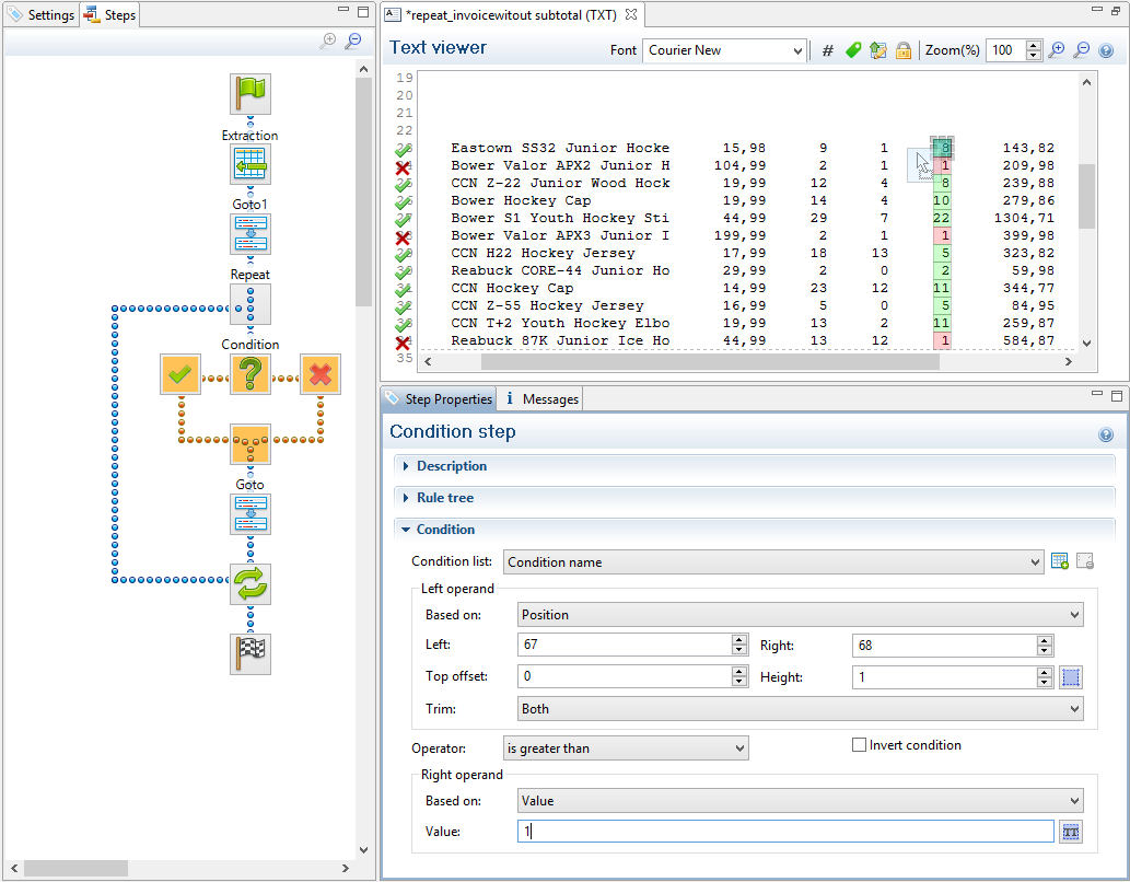 In the Step properties pane, you will see that the newly added Condition step checks if the selected position (the left operand) contains the selected value (the right operand). Both operands and the operator can be adjusted.