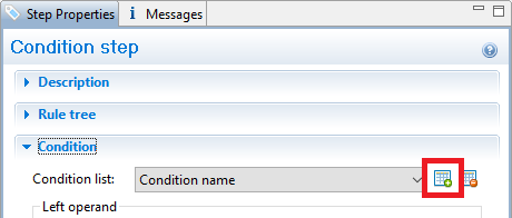 For an overview of all options on the Step properties pane, see Condition step properties.