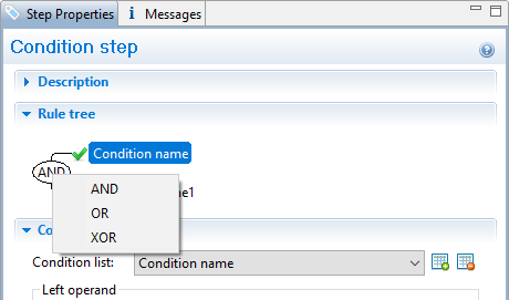 Rules are by default combined with AND. To change the way rules are combined, right-click "AND" in the Rule Tree, on the Step properties pane, and select OR or XOR instead. (XOR means one or the other, but not both.)