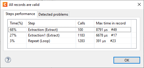 If no errors were encountered while validating the records, information about the performance of each step is displayed in a grid. These metrics help you identify which steps are consuming the most time, so that you can review them and improve overall performance.