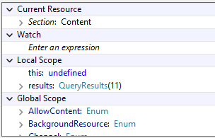 If the current script is not a Control Script, the overview includes the special entry "Current Resource". When expanded, this entry shows the HTML of the current Master Page or section, allowing you to see exactly how each line in the script affects the DOM.