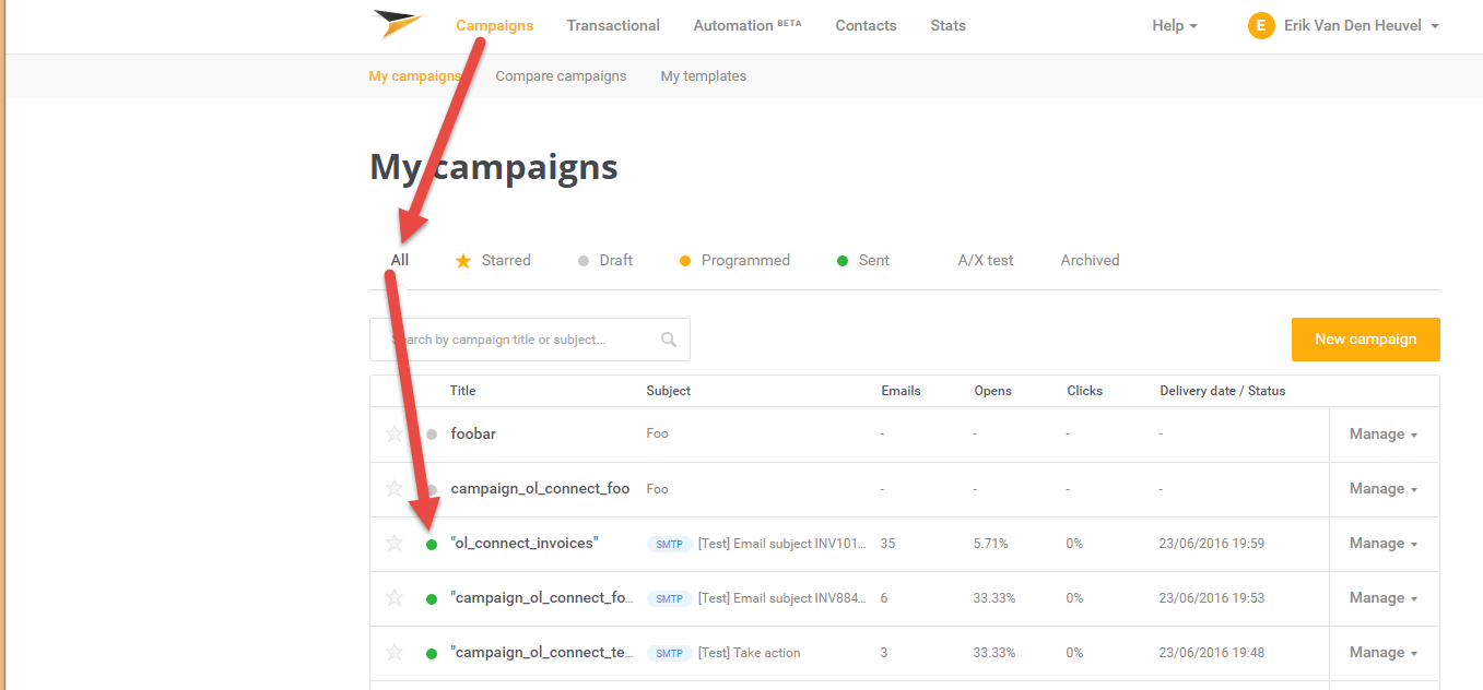 Note: Mailjet strips out their own mailheaders like X-Mailjet-Campaign. The results can only be verified via the respective campaign stats page in the Mailjet dashboard. There is no need to pre-create the campaign: adding it to the email header via a Control Script auto-generates the campaign. To view the campaign, login to Mailjet and choose: Campaigns > All.