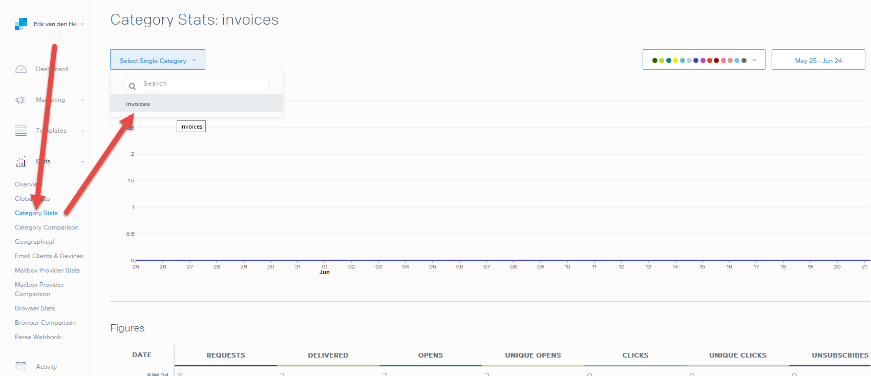 Note: Sendgrid strips out their own mail headers. The results need to be verified via their Dashboards (e.g. the Stats section lets you verify the stats for specific categories). Alternatively one can use their Web API to retrieve stats in JSON format. To view the category stats, log in to Sendgrid and choose: Stats > Category Stats > your category name.
