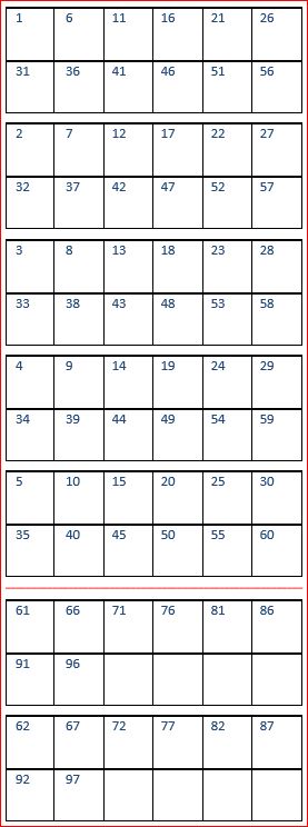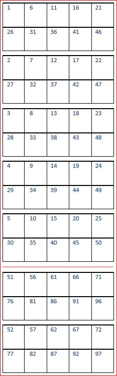 Each set of 5 Imposition Sheets is a discrete drill sorted nUp block that can be guillotined and stacked. The first 5 sheets encompass records 1-50, whilst the next 5 sheets encompass records 51-100.