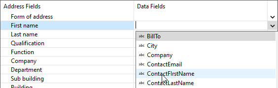 To connect a data field to an address field, click the Data Fields column, then select the field that provides the data for that address field.