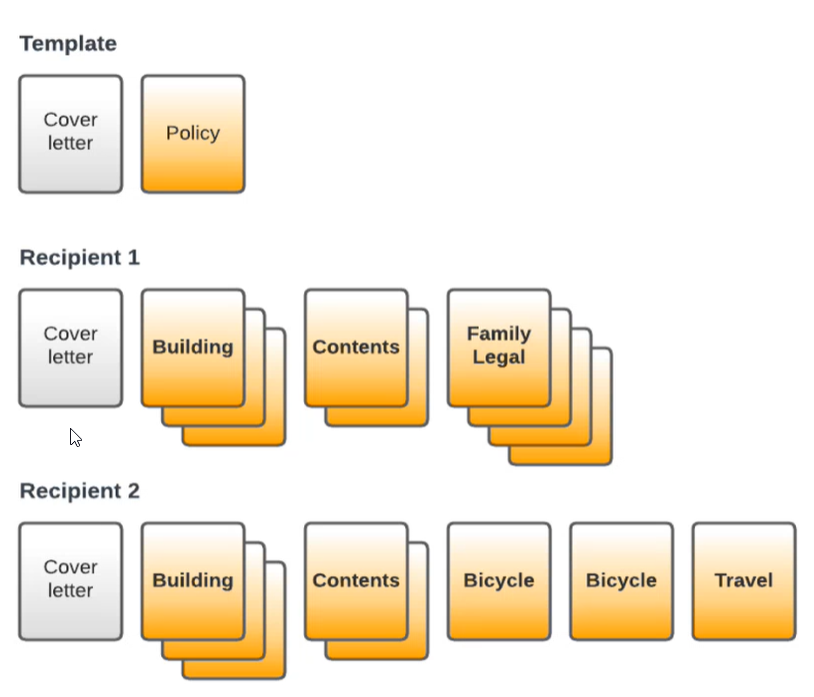 In the case of insurance policies, for example, a template would only need to contain a cover letter section and a policy section. For each recipient, the policy section would be cloned as many times as necessary, i.e. once for each insurance the recipient has.