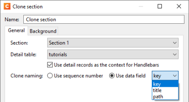 Normally, Handlebars expressions in sections and clones retrieve data from the current main record. To make Handlebars expressions work on the detail record that was used to create the clone, rather than on the main record, select Use detail records as the context for Handlebars. The benefit of this is explained in Handlebars expressions in section clones.