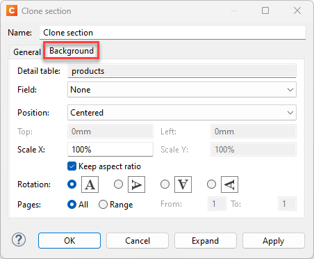 (Optional:) Switch to the Background tab if you want to apply PDF background images to the clones. See Setting a background image for section clones.