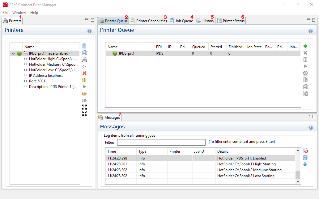 The Print Manager display initially appears as in the following image (and can be re-set to this view at any time, via the Windows > Reset Perspective menu option):