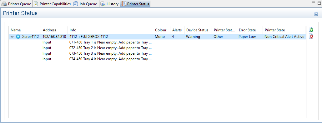 This pane can be used to monitor the state of PostScript and PCL printers. It contains general printer information, such as the printer's B&W or color settings, as well as the quantity of paper in trays, any outstanding alerts or errors and whether the printer is currently in use, or awaiting a job. An example of this can be seen in the following image: