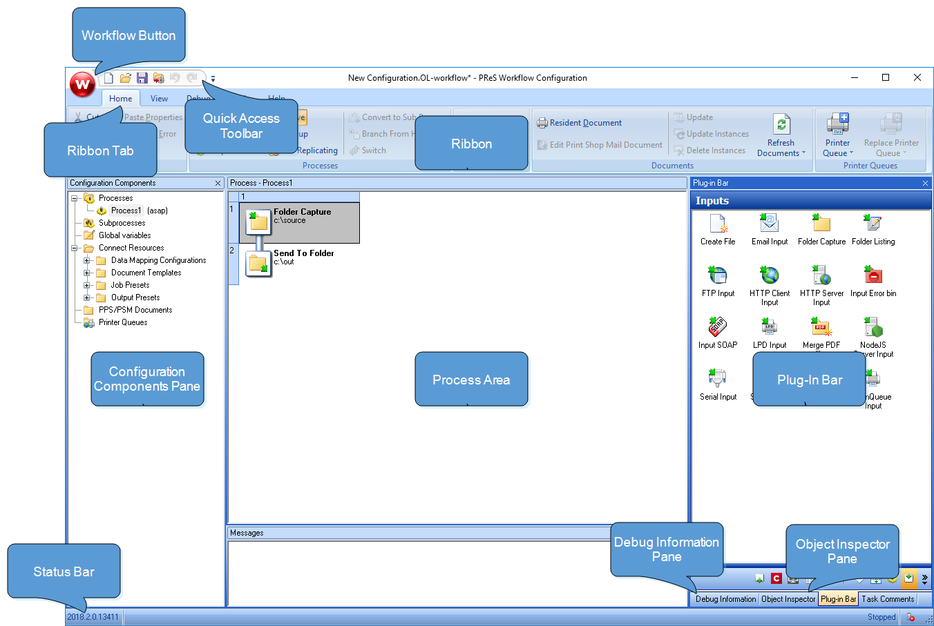 - The dockable panels including The Plug-in Bar, The Object Inspector pane and The Debug Information pane.