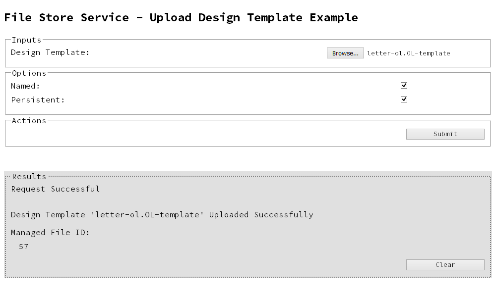 Once the template and options are selected, simply select the Submit button to upload the template to the server's file store and the resulting Managed File ID for the design template will be returned and displayed to the Results area.