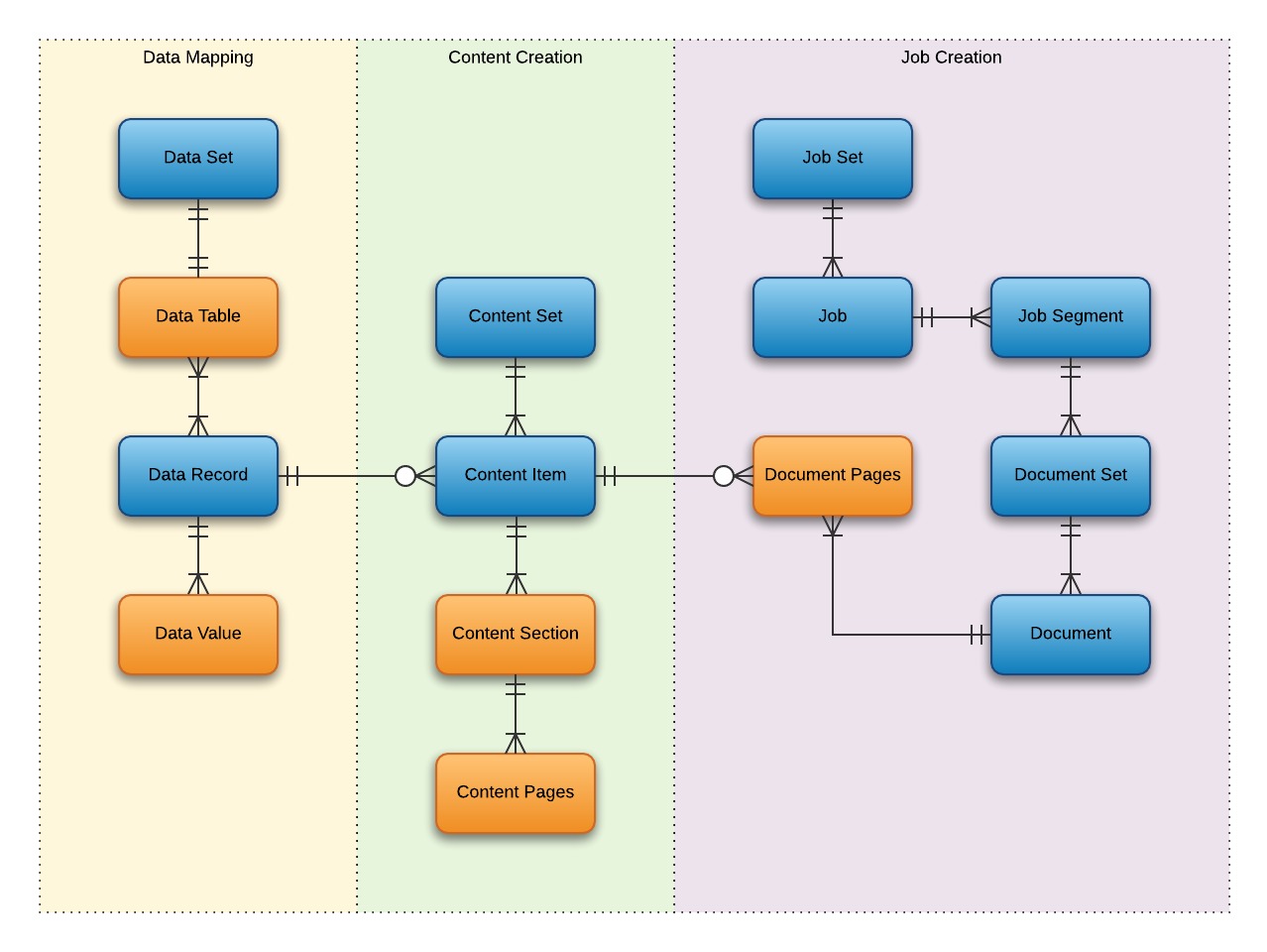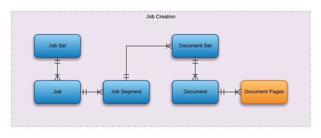 The job set and job entities (shown above in blue) are accessible via the Job Set Entity and Job Entity services. The job segment, document set and document entities (also shown above in blue) are accessible via the Job Segment Entity, Document Set Entity and Document Entity services.