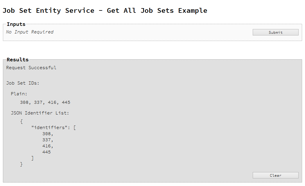 To run the example simply select the Submit button to request a list of the all the job sets currently contained within the server.
