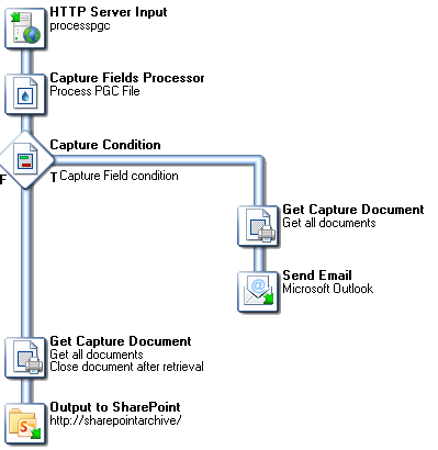 Here is an example of a process that receives ink data, updates the database, and then verifies whether or not a field that indicates manager attention is required (for example, a box noting the wrong number of items in a delivery slip). If attention is required, the document is sent via email to the manager. Otherwise, the document is simply archived.