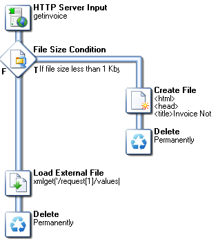 This straightforward workflow simply receives a GET request from a browser, loads an existing PDF invoice from a folder on the hard drive, and returns it to the browser. To do this, a client (or a web service) would request the following page: