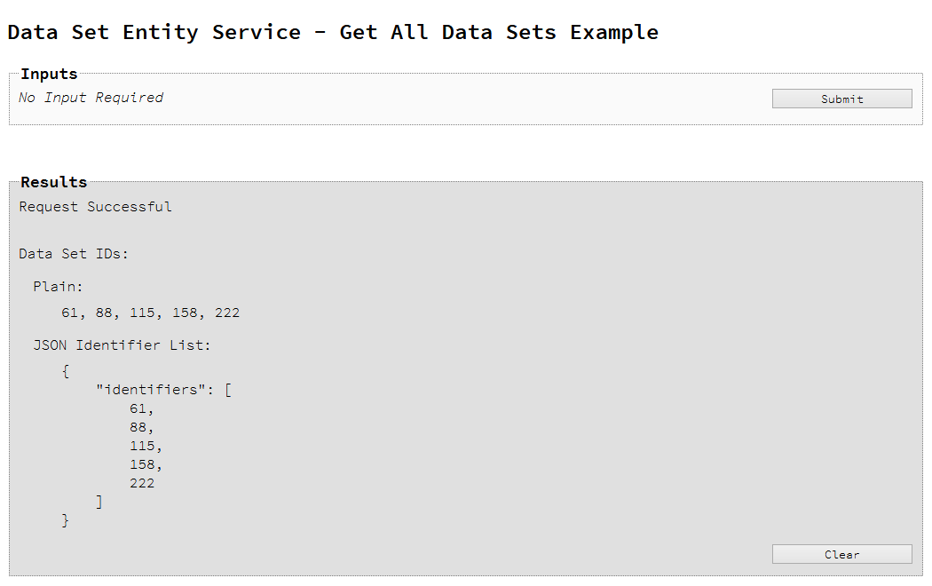 To run the example simply select the Submit button to request a list of the all the data sets currently contained within the server.
