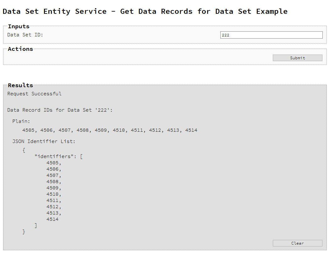 To run the example simply enter the Data Set ID and select the Submit button to request a list of the all the data records contained within the specific data set in the server.