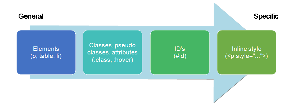 Rules for HTML elements (p, table, li etc.) are general rules. Rules for classes, pseudo classes, and elements with a certain attribute (.class, :hover, [target]) are more specific. Rules for elements with a certain ID are even more specific. The most specific are inline styles.