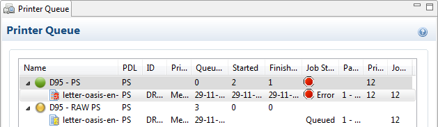 The PostScript printer entry in the following image shows how a printer error state is represented within Print Manager when a printing or connection error occurs. The printer is still active (and thus the printer status icon remains green), whilst the job itself is stopped due to the error. This printer is, in effect, in a paused state whilst it waits upon the error being fixed, or the job being removed from the queue. -