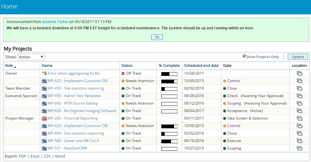 Administrators have the ability to make system-wide announcements that will appear on every user’s screen when they are logged in to PowerSteering. These announcements will remain on the user's screen until they are acknowledged.